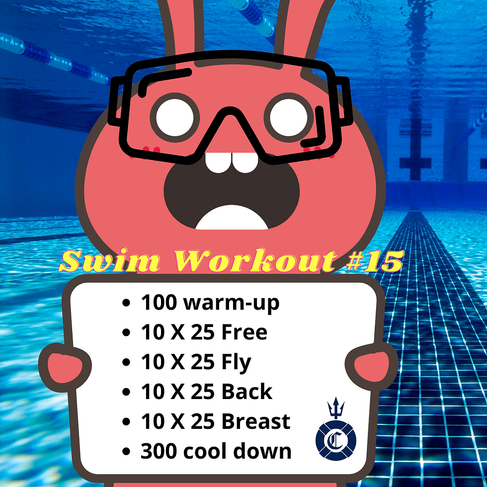 Swim Workout # 15Samuel CookseyMar 23, 20221 min read100 warm up 10 x 25 Free10 x 25 Fly10 x 25 Back10 x 25 Breast300 cool down I don't think swim bunny likes to swim. If swim bunny can do it so can you! #swimminglessons #swimmom #swimming #mastersswimming #swim #swimmingclass #swimmingmemes #lovetoswim #swimclass #swimmemes